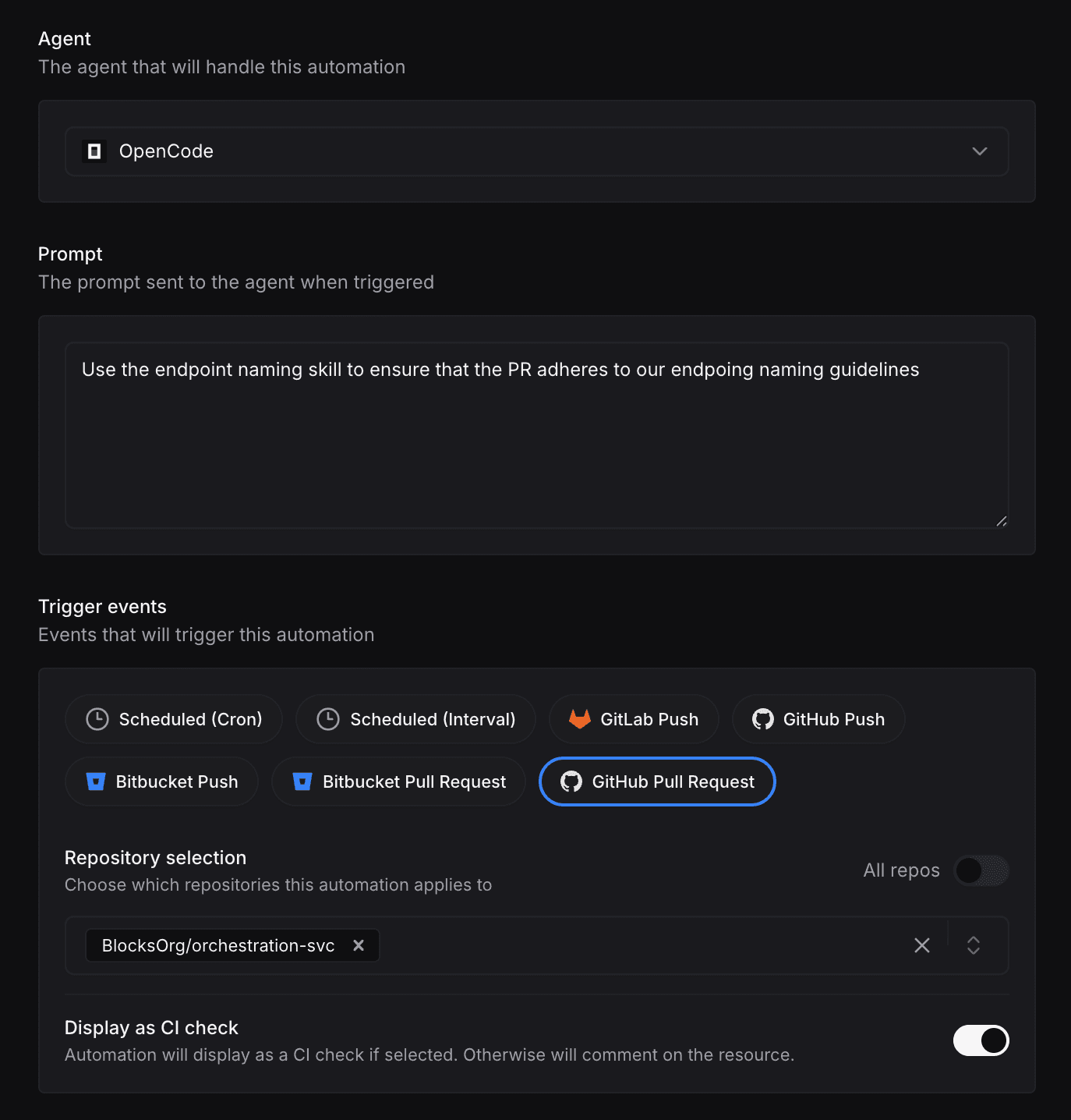 In the Blocks dashboard, we created an automation with OpenCode as the agent. The prompt is one line: use the endpoint naming skill to check whether the PR follows our naming guidelines. Trigger is set to GitHub Pull Request, scoped to BlocksOrg/orchestration-svc. Then one toggle: Display as CI check.